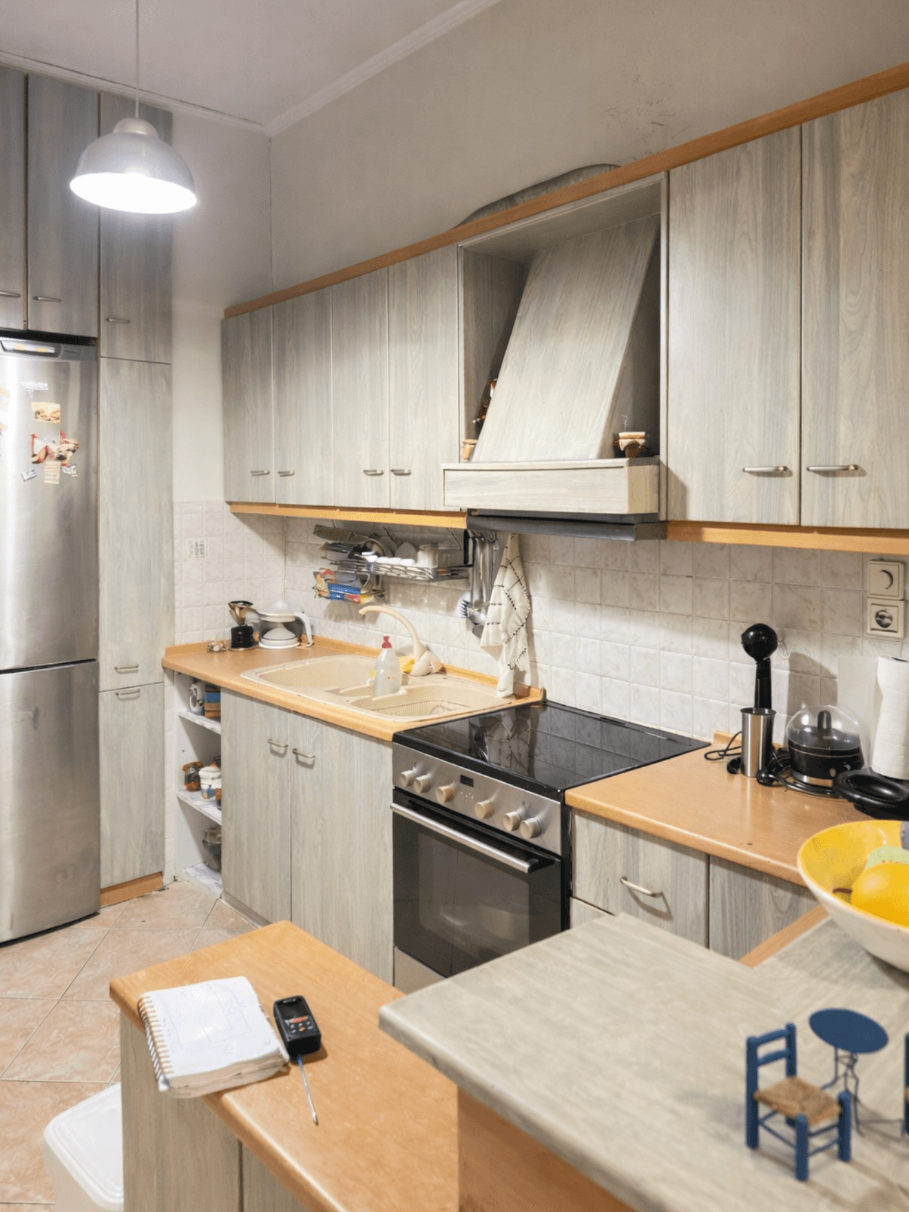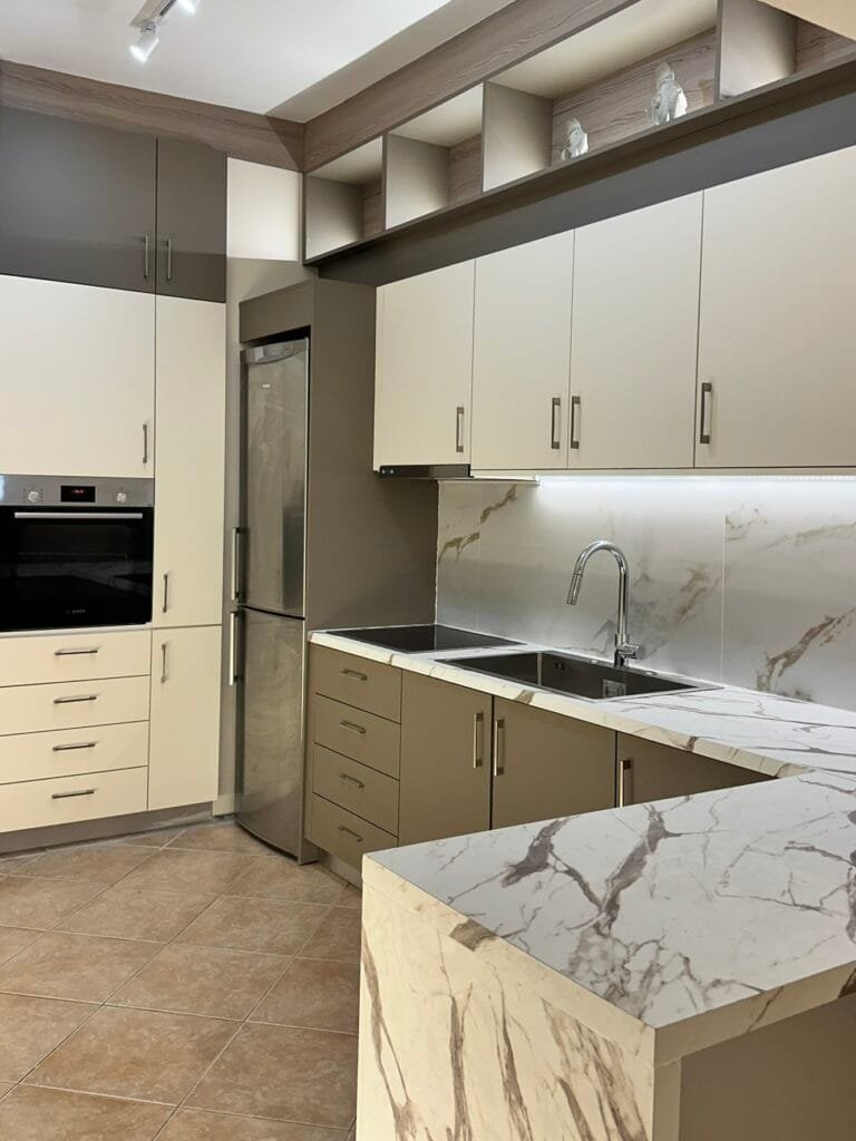 Η κουζίνα ακολουθεί ένα σύγχρονο, κομψό minimal στυλ, με έμφαση στη γεωμετρία και τις καθαρές επιφάνειες.