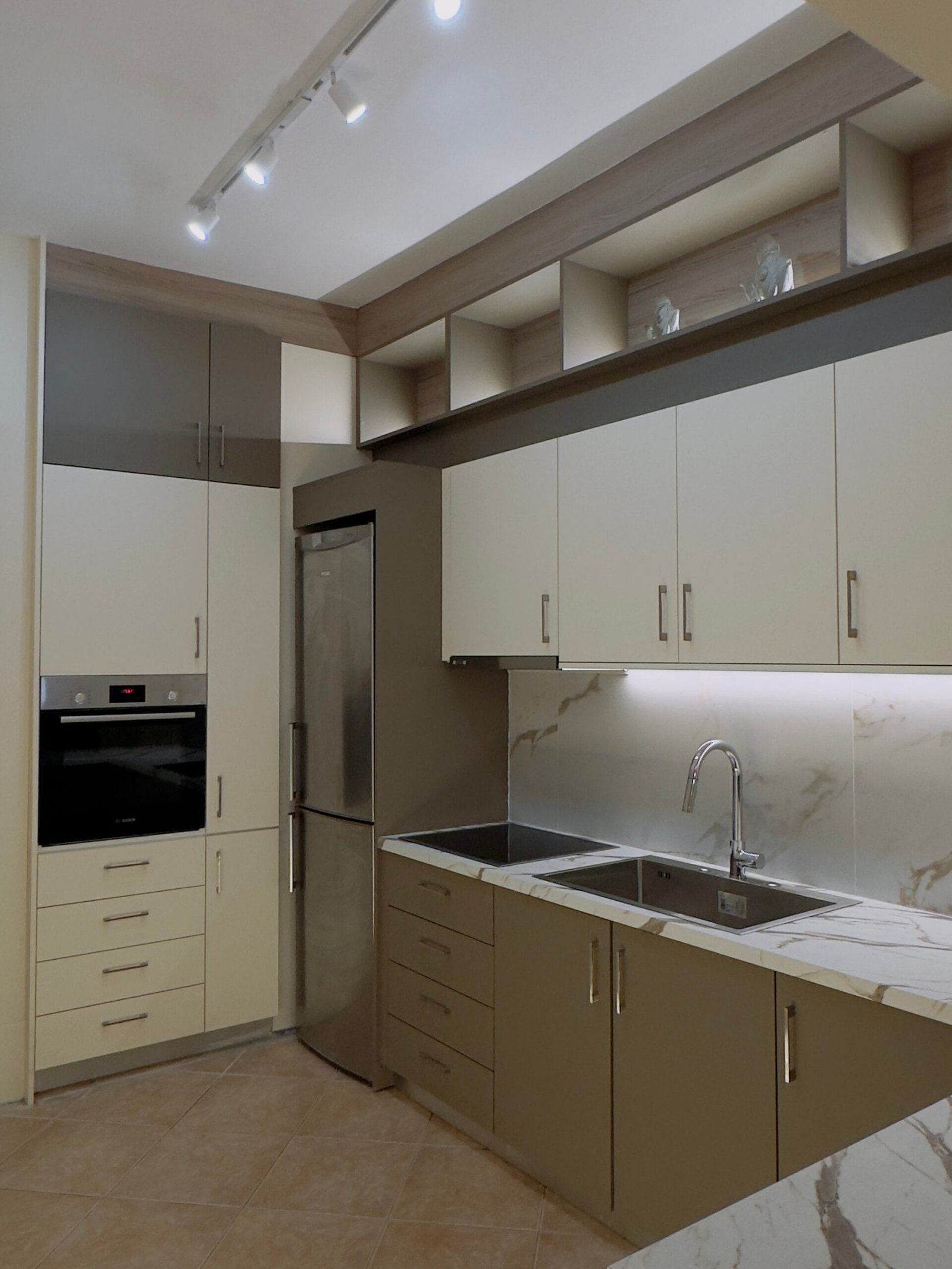 Ανοιχτό μπεζ / off-white στα ντουλάπια.