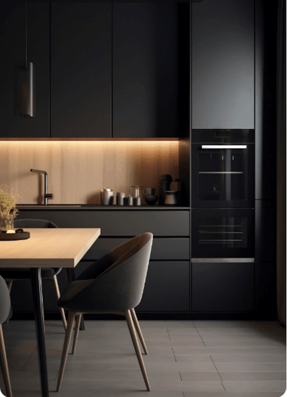 Επιλέχθηκαν μαύρα ματ ντουλάπια μεγάλης χωρητικότητας, με αφανείς λαβές και άψογο φινίρισμα. Ο ξύλινος πάγκος και η ξύλινη επένδυση στο backsplash προσθέτουν φυσική υφή και ισορροπούν τον μοντέρνο χαρακτήρα.
