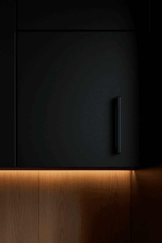 Πλάτη (backsplash) & φωτισμός: Ο κάθετος φωτισμός LED κάτω από τα ντουλάπια αναδεικνύει τις υφές και δημιουργεί ζεστή ατμόσφαιρα. Η ξύλινη επιφάνεια στο φόντο προσθέτει βάθος και οπτικό ενδιαφέρον.