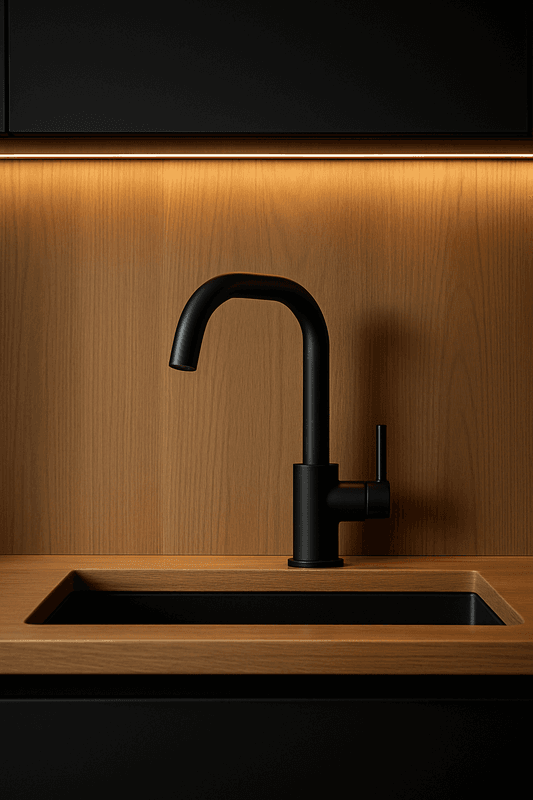 Βρύση & εργονομία: Η μαύρη μπαταρία με λιτή γραμμή ενισχύει τη μινιμαλιστική αισθητική και εξασφαλίζει πρακτικότητα. Ο χώρος εργασίας είναι άνετος και καλά φωτισμένος, ιδανικός για καθημερινή χρήση.